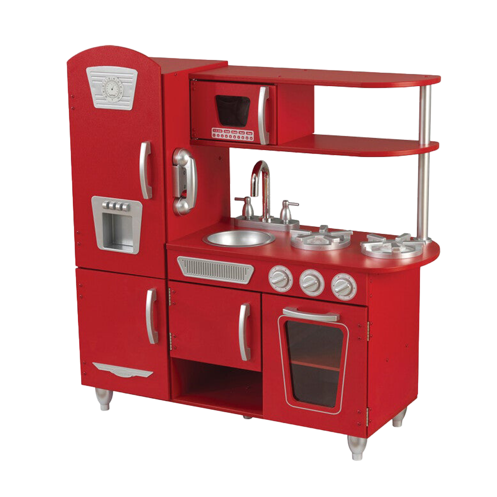 KidKraft Vintage Wooden Play Kitchen Kids can have hours of play time fun in this sleek kitchen with stainless-steel-look fixtures. There are knobs to turn and doors to open to keep children busy emulating what they see in the kitchen.