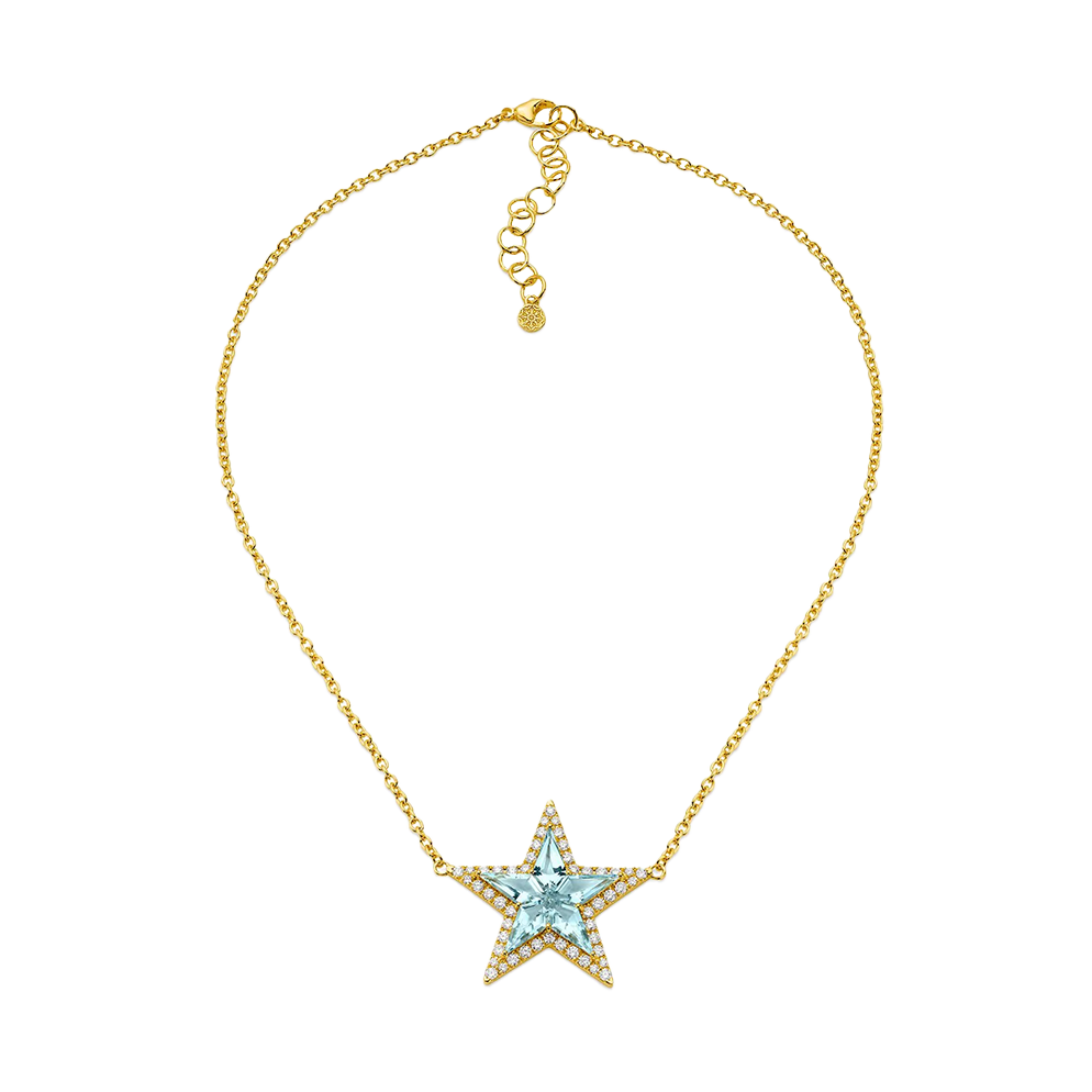 Buddha Mama Aquamarine Kite Star Necklace Buddha Mama's stunning necklace with large and vivid star pendant is sixteen inches long with a two-inch extender. In 20 karat gold with a polished finish and aquamarine and white diamonds.