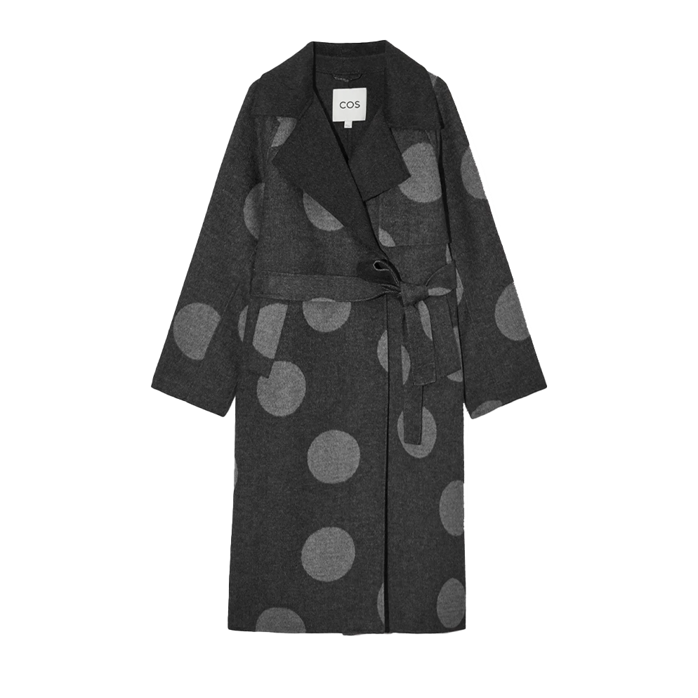 Cos Oversized Polka Dot Wool Coat In a light gray and charcoal palette, this oversized coat is crafted from a naturally insulating wool blend and decorated with oversized spots.