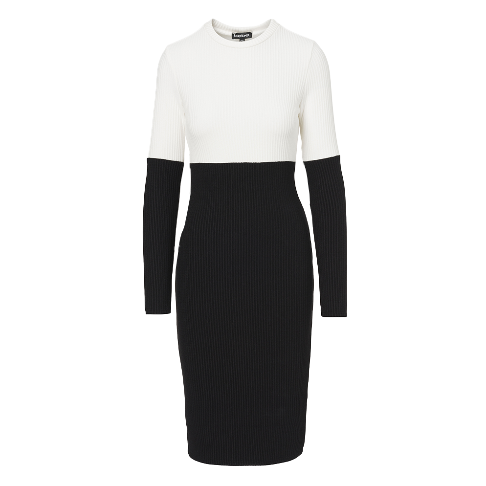 Bebe Midi Color Block Sweater Dress Contrasting and perfectly neutral colors combine in this knit dress with a chic midi length that will keep you dressed up---and delightfully warm---in fall and winter.