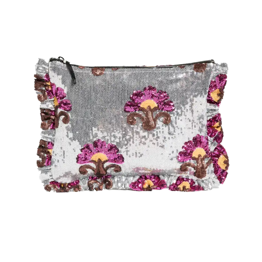 La Double J Hand Pouchette Clutch La Double J's oversized zip pouch in opulent textured paillettes has a uniquely ruffled edge and floral print. Featuring a zip closure and slip-through handle, it's an elegant pouch with hands-free ease.