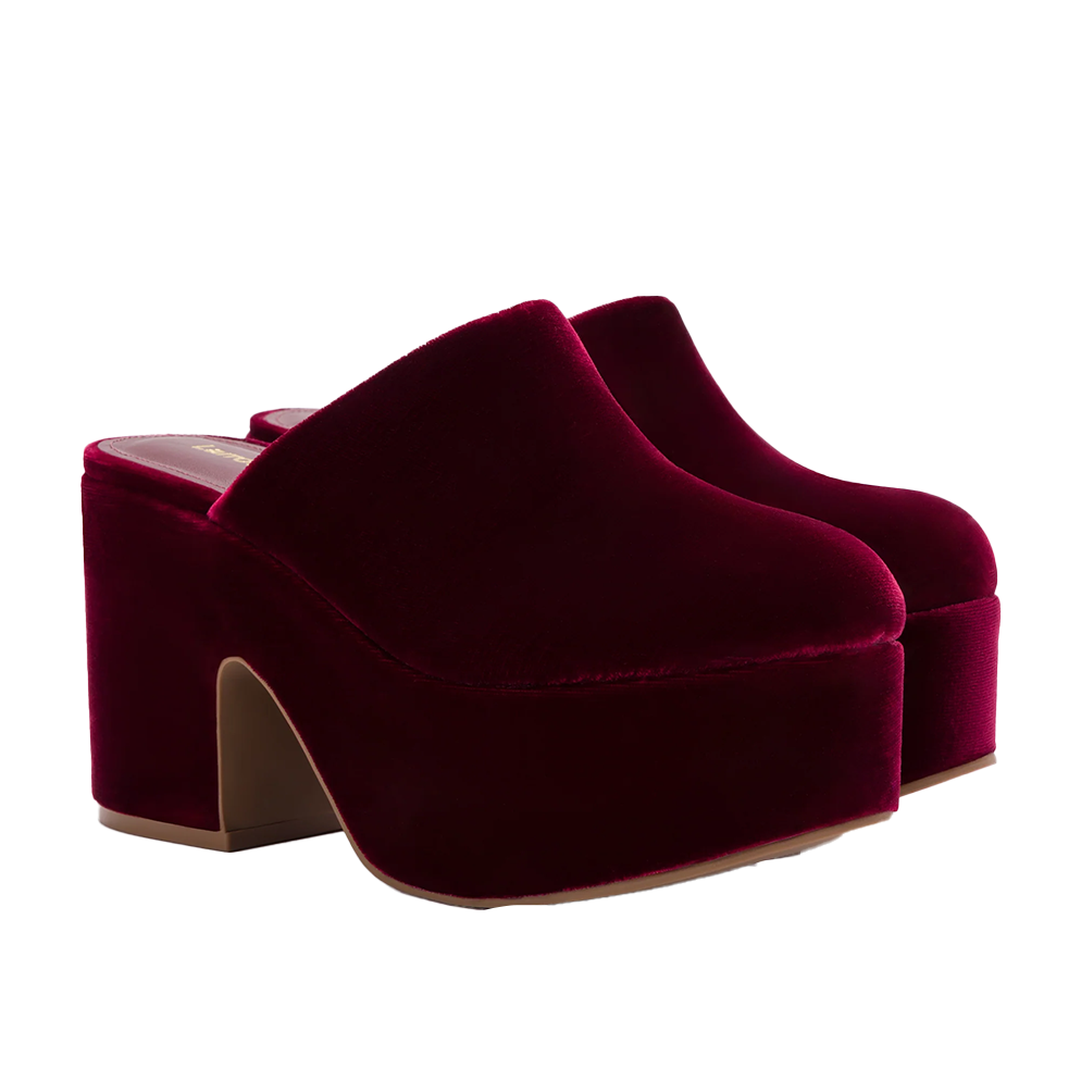 Larroude Miso Platform Clog in Wine Velvet The perfect clog silhouette, modern and chunky, this shoe makes a statement wrapped in velvet with its platform base and rounded toe to keep you supremely comfortable for all day wear.