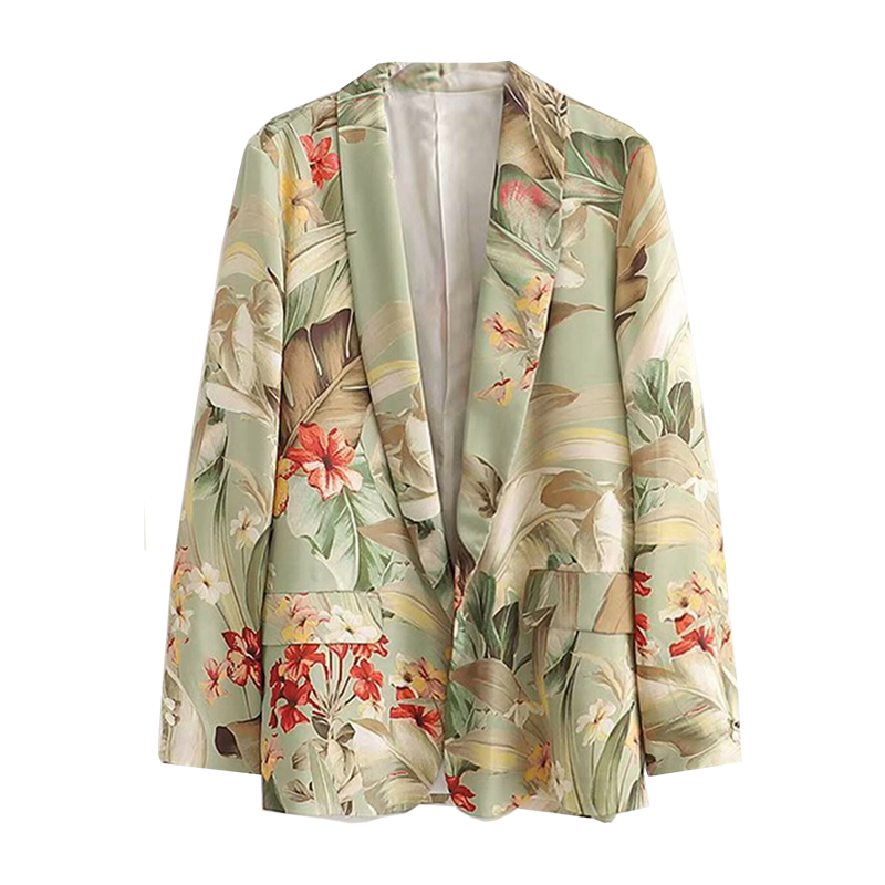 Pair this tropical print blazer with paper bag-style shorts or baggy jeans, heels, and a tee.