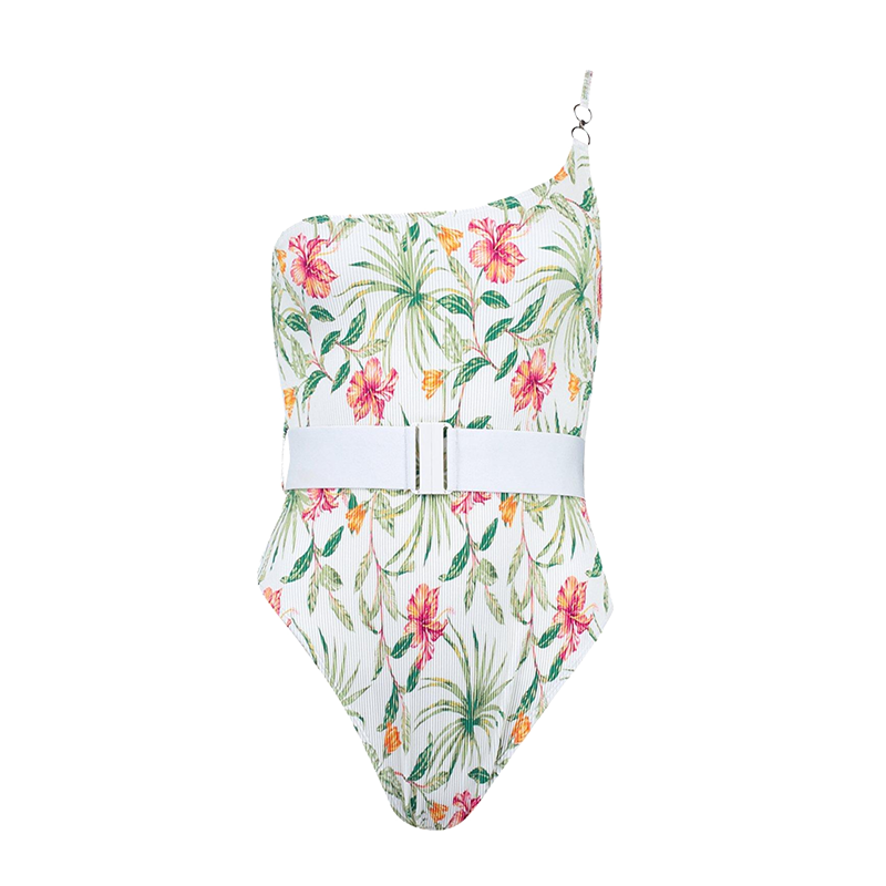 One shoulder belted swimsuit combines sophistication with a playful tropical print.