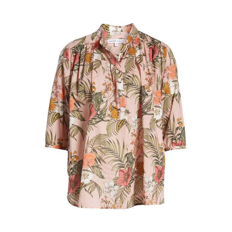 A tropical floral-palm print enlivens this breezy cotton top styled with flowy pleats and a curved shirttail hem.