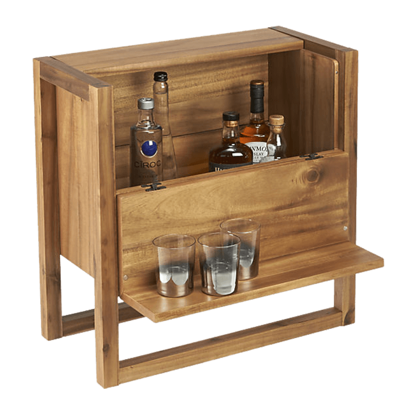 This space-saving mini bar is handcrafted of solid, sustainable acacia wood. Flip it open on both sides for a self-serve bar that showcases your bottle collection while a lower ledge holds glasses.