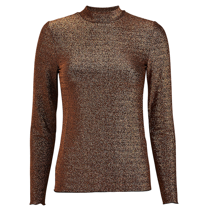 This shimmering lurex turtleneck sets the perfect foundation for elevated fall ensembles.