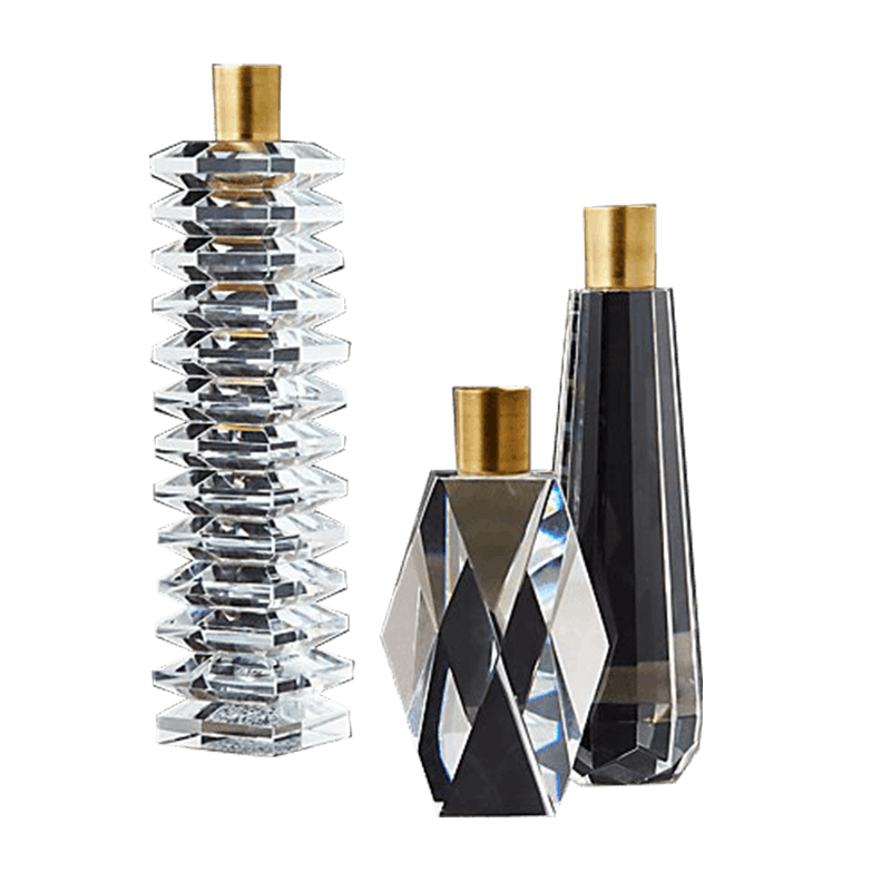 K9 crystal is hand-cut to surface multi-faceted texture that bounce light in all directions. Real, shiny brass adds chic accent on top. Set of three taper candle holders creates a modern mix of height and texture.