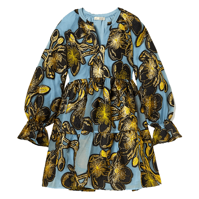 Crafted from elegant light blue organza, this style features a playful and voluminous silhouette, long balloon sleeves with a flared detail at cuffs and a round neckline with a hook-and-bar closure and a slim loop at chest.