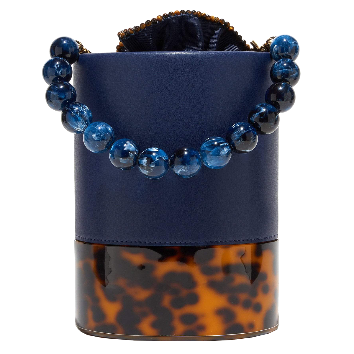 The Dallas bag, a two tone leather and acetate bucket bag measures 8" tall by 6" wide made from genuine calfskin leather and tortoise acetate with twill drawstring trimmed in tiger's eye beads to keep all your valuables in place. Light-weight.