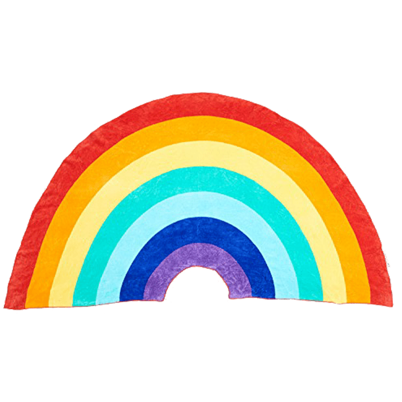 Tap into the trend of the season with this cheerful rainbow towel . Combine with a suit in yellow, blue lensed shades, and breezy white linen drawstring pants.