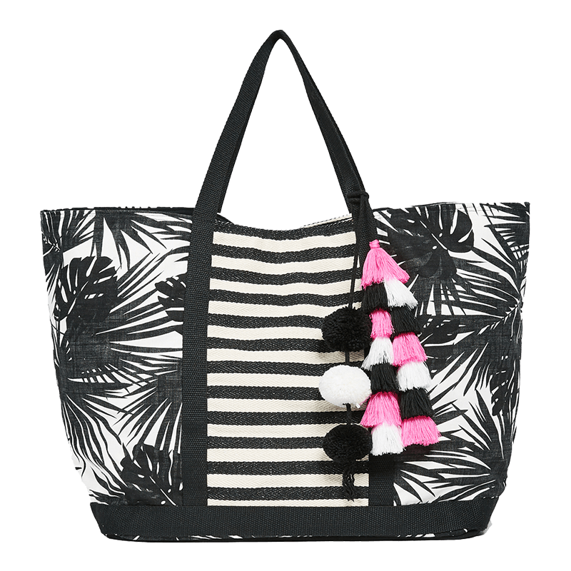 Combining multicolored pom poms as well as palm and striped prints, this is a beach bag that stands out from the rest. Jadetribe is a favorite go-to of ours for bags and pouches steeped in fun and casual vacation style.