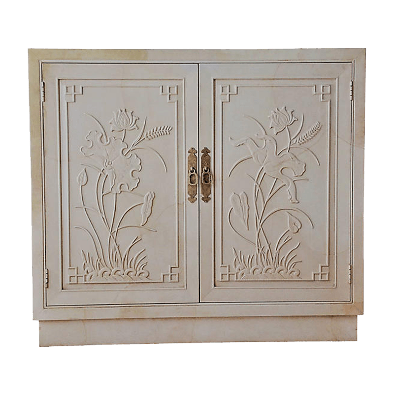 This regency-style vintage bar cabinet is a sophisticated disguise for bottles and glasses. By Henredon Fine Furniture, in white wood, brass hardware and textured floral design. 36" L x 18" W x 32" H