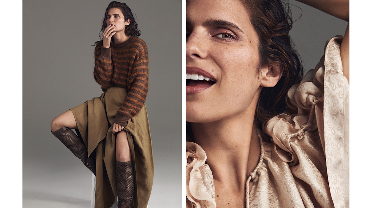 LEFT: Acne Sweater; Salvatore Ferragamo Skirt and Boots. RIGHT: Chloé Blouse at Bergdorf Goodman.