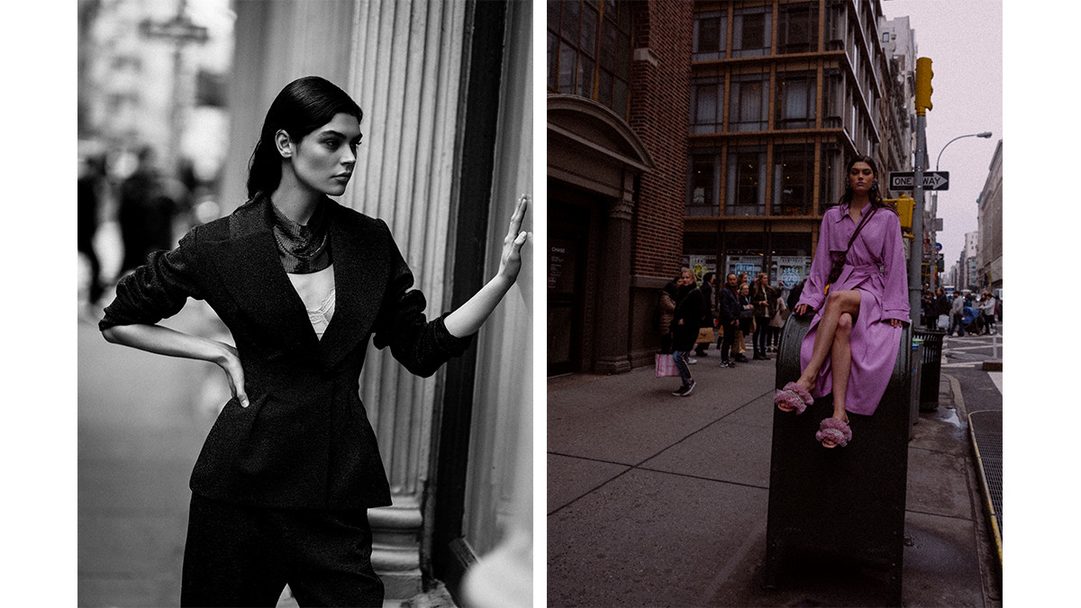 LEFT: Sid Neigum Suit; Mignonne Gavigan Necklace; Morgan Lane Bra. RIGHT: Dries Van Noten Coat; Roksanda Bag; Suecomma Bonnie Slides; Mignonne Gavigan Earrings.