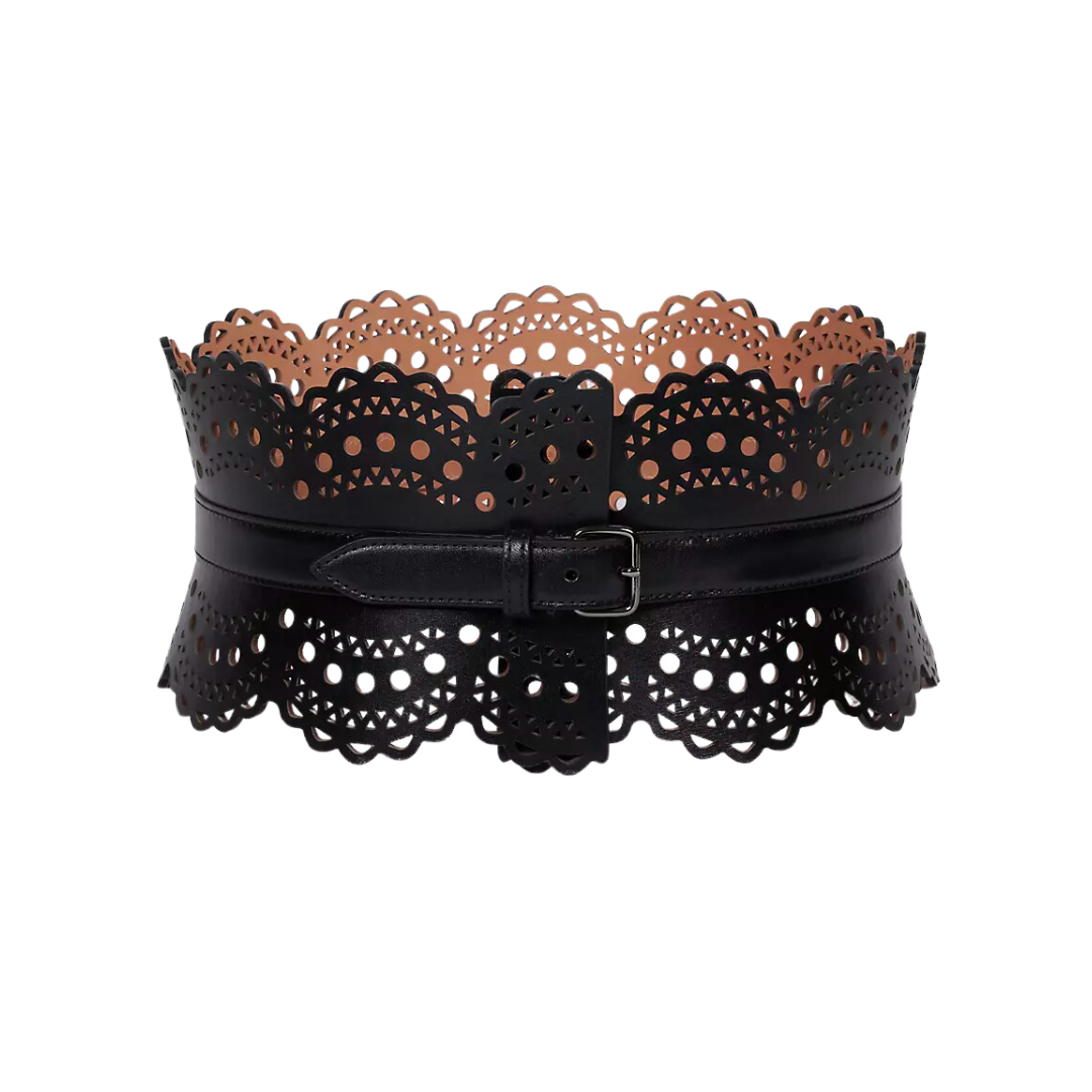 Alaïa's signature intricate laser cut detailing creates a feminine lace-effect against this scalloped leather corset belt. A high fashion investment piece you'll turn to for years.