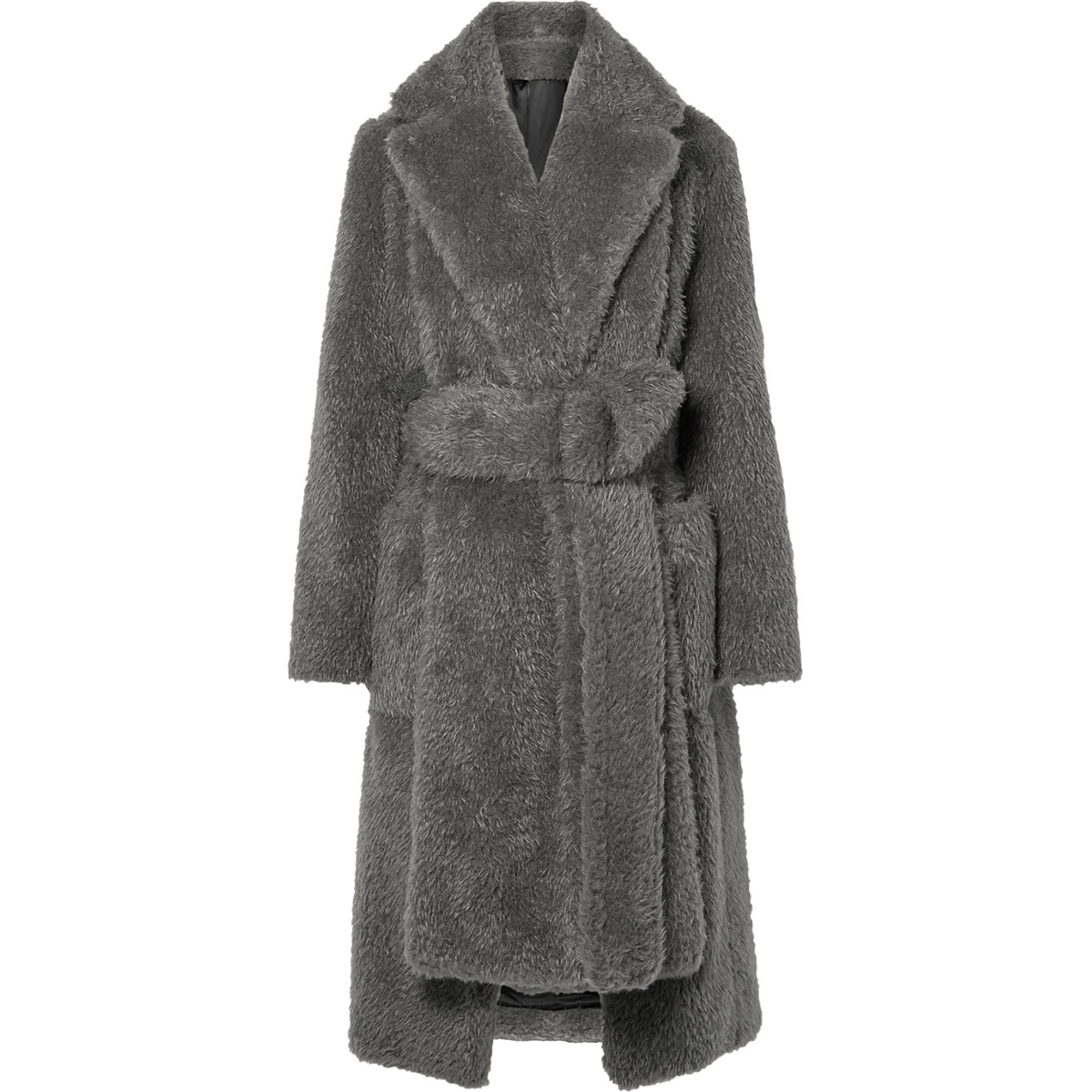 The Helmut Lang shaggy belted coat is a top coat with a belted waist and removable collar detail.