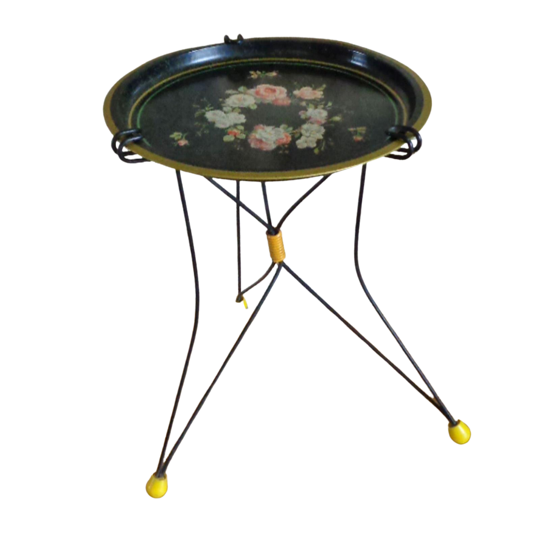 A French mid century round toleware tray table with a black floral top and folding black metal and yellow stand. This tin tray has a very stylish black metal tripod shaped stand which makes it a very versatile piece of home decor; use it as a side table for holding snacks, coffee cups etc.