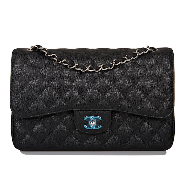This Jumbo Classic Double Flap bag is in black caviar leather with silver tone hardware and features a front flap with signature CC turnlock closure, half moon back pocket, and adjustable interwoven silver tone chain link and black leather shoulder strap.The interior is lined in burgundy leather with a "love letter" zipper compartment under the first flap, an "outer" slit pocket under the second flap, and an interior compartment with two open pockets separated by a "lipstick" compartment.