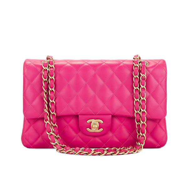 Preowned: Light wear throughout. Pink quilted lambskin leather with gold-tone hardware exterior with smooth leather interior lining. Foldover flap top with turnlock closure. One main compartment with single interior zip and divided flat pocket and two interior flat pockets. Single exterior flat pocket. ncludes original dustbag. Circa 2013-2014.