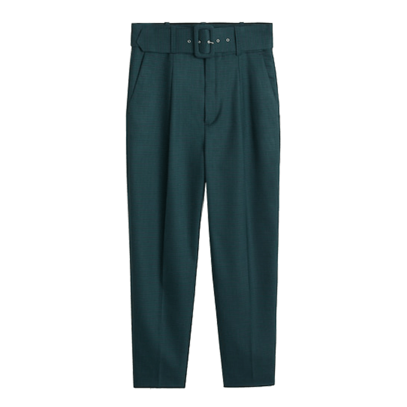 Check fabric. Straight fit. Medium waist. Decorative belt. Two side pockets. Zip fastening on the front section.