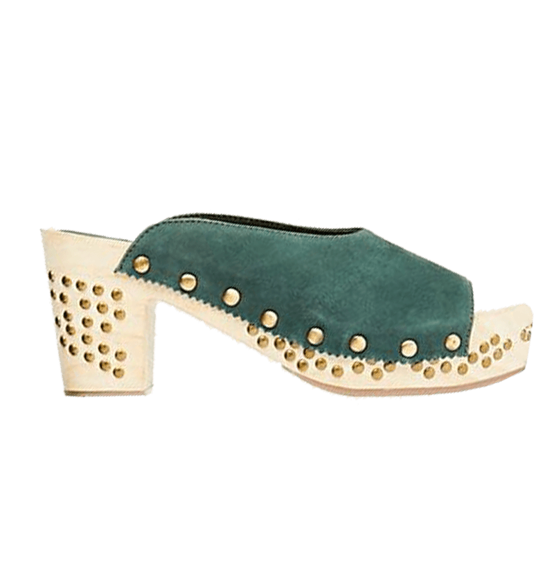 We love the rock ‘n’ roll vibe of these green suede open-toe clogs with all-over metal stud detailing. Cutting edge, on trend, and different from the rest, these clogs are the standout pair of shoes your summer wardrobe needs.