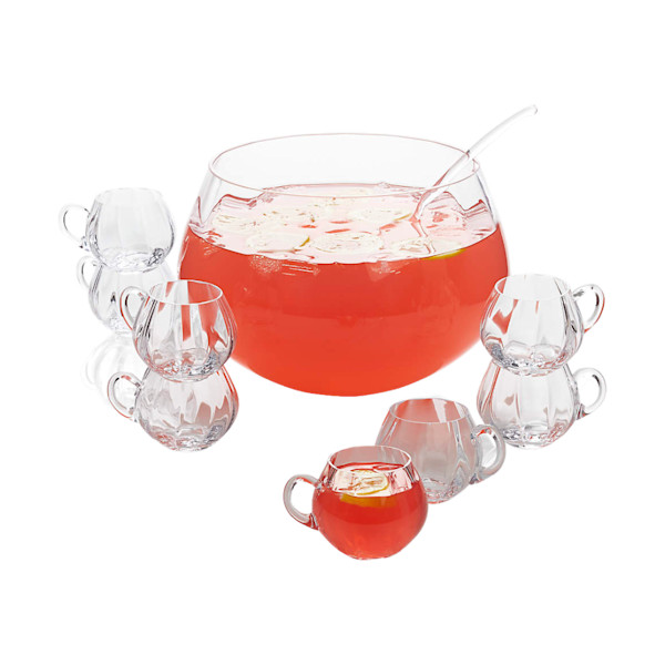 Three-gallon punch bowl, eight ten ounce cups. Old-school entertaining with a new-school optic design. Generous glass bowl features faceted sides that curve to create the low, rounded shape for ladling beverages or floating flowers and candles on table or buffet. A long, elegant glass ladle completes the set.
