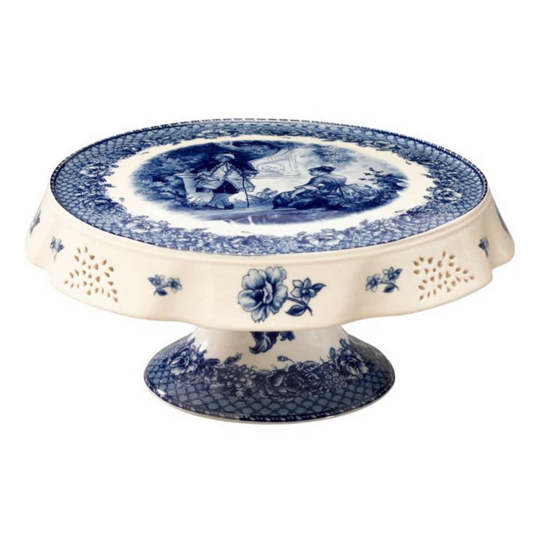 This heirloom-worthy cake stand is crafted of porcelain and finished with a timeless transferware design in blue and ivory.