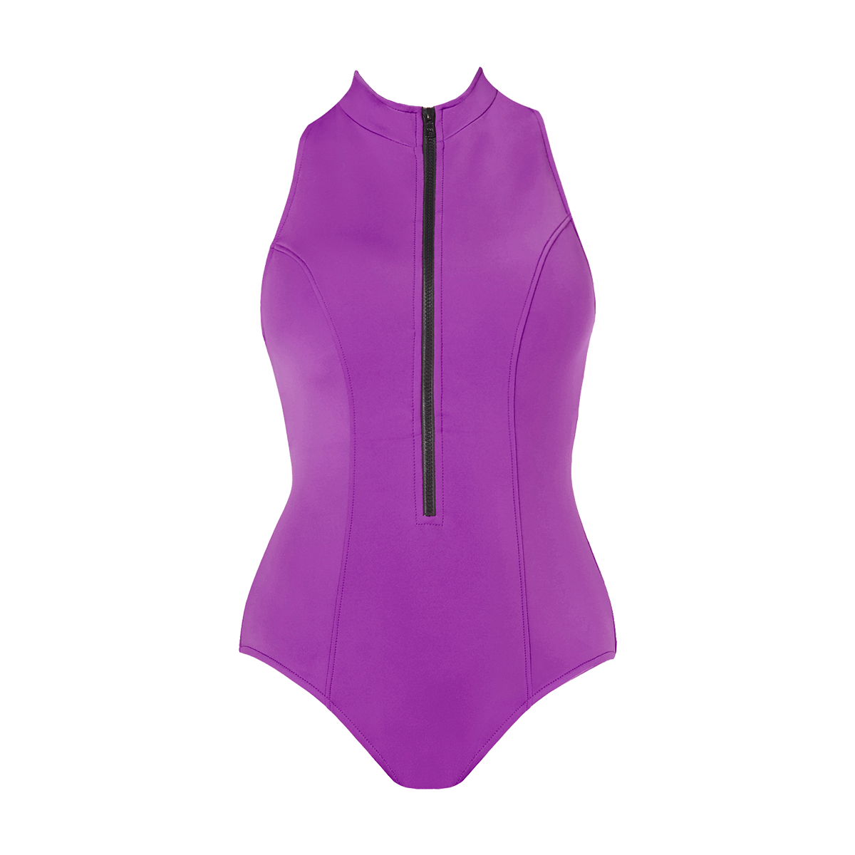 Distinct neoprene fabric skims your curves while a higher set neckline leads to a front zip style while zipper embellishments above the bust and at the hips offer an added touch to your swim décor. Underwire styling keeps you comfortable and controlled from sun up to sun down.