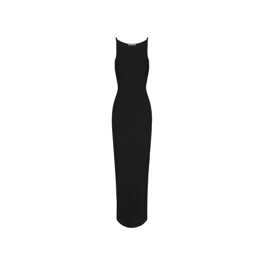 Eterne Iris dress crafted from butter soft ribbed modal blend cotton. This sleeveless dress features a high neckline and a body-skimming, full length silhouette.