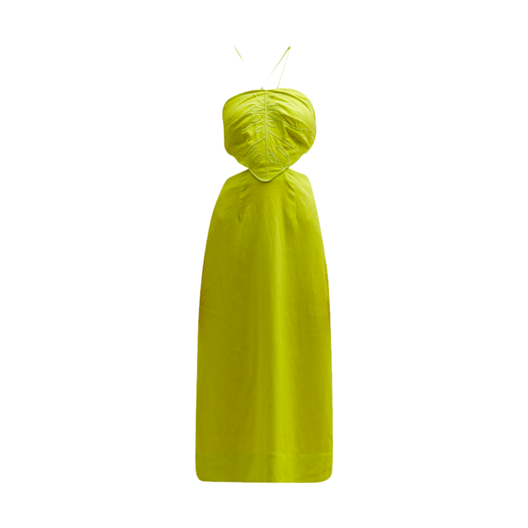 A stand-out look in lime green. Open-back, monstera-shaped bodice with embroidery. Halter neckline, adjustable crisscross straps, cut out waist and back slit.