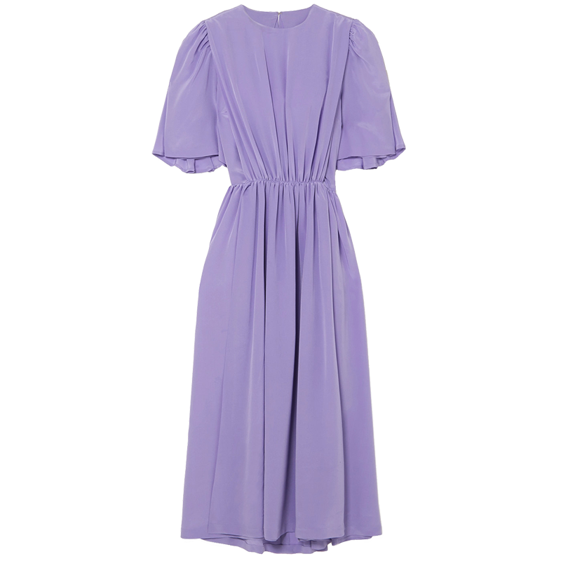 This flowy dress is cut from silk, which gathers around the waist and shoulders for the ultimate flattering effect. With an open back and two front splits, our favorite way to style it is belted and over slim pants.