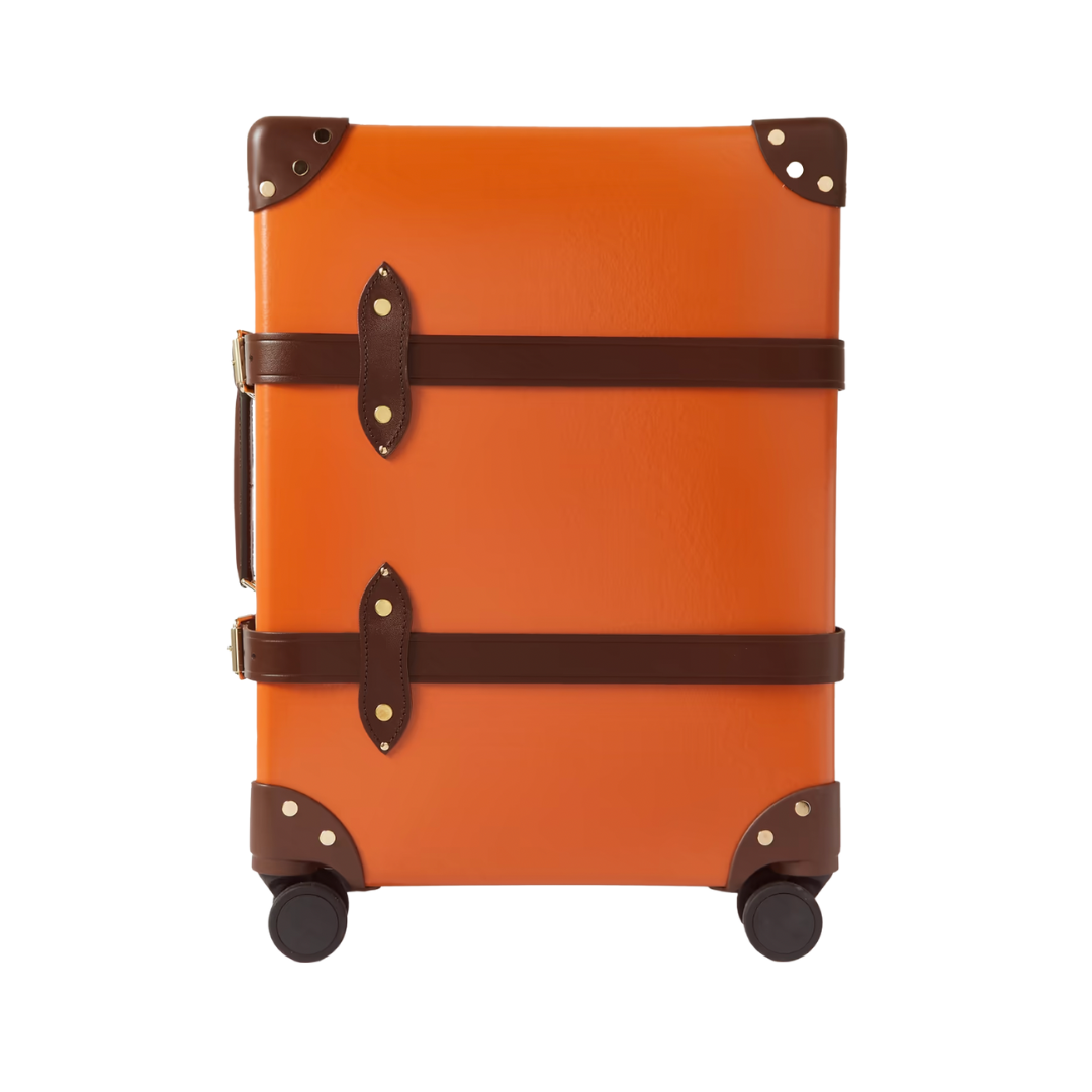 The distinctive orange colorway of Globe-Trotter's Centenary carry-on suitcase stands out against the style's classic brown leather straps and trim. The range features a marmalade orange Vulcanised Fibreboard body with classic brown leather, exquisitely finished with polished brass hardware.