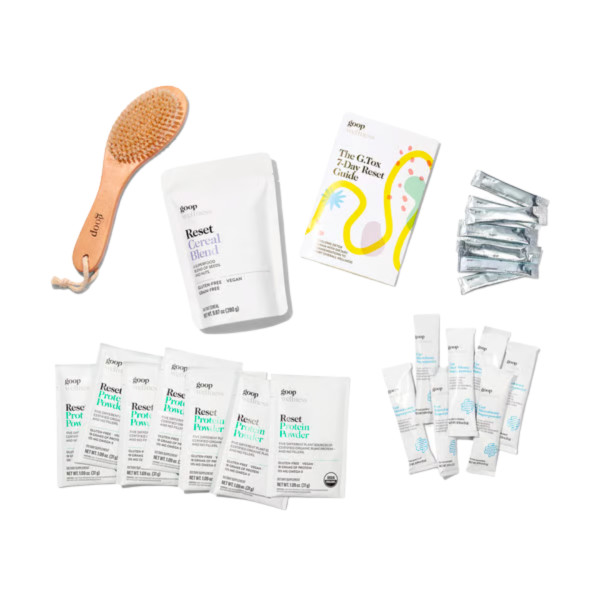 The G.Tox 7-Day Reset Kit gives you the tools to do a weeklong elimination program with ease. Goop's kit provides a filling superfood cereal blend, a plant-based protein powder, and a recipe guide to take the guesswork out of the process. An easy-to-follow schedule helps you experiment with new eating patterns and an intermittent fasting protocol. Includes added support from daily superpowders formulated to help promote the body’s natural detoxification system and promote digestive health.