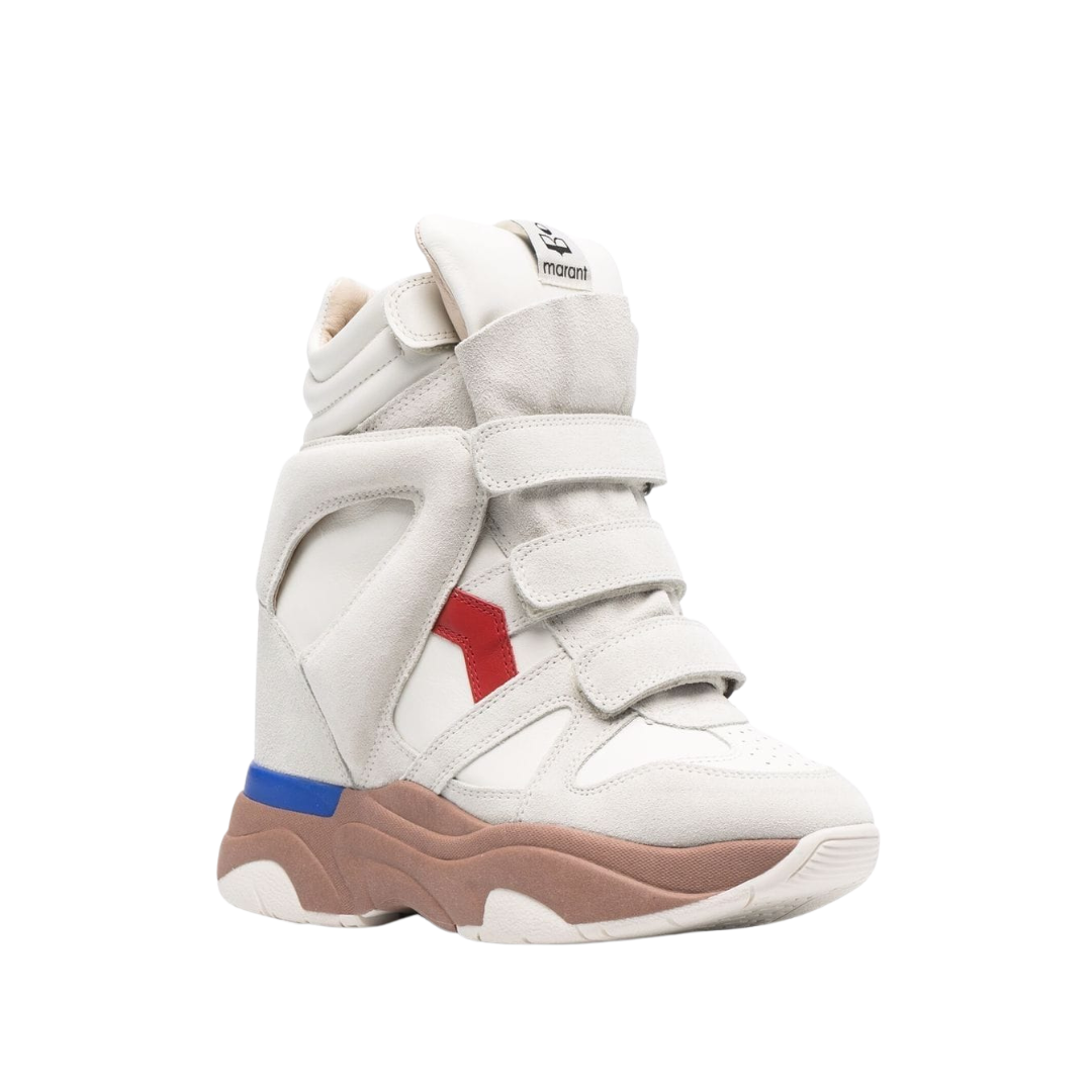 Velcro strap suede tri-tone sneakers in suede, leather, and rubber with mid wedge heel and branded insole.