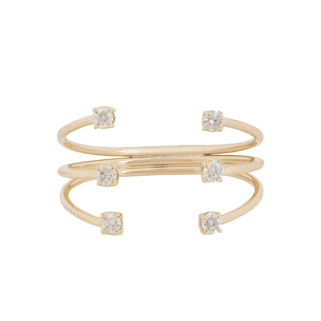 Jennie Kwon diamond and gold tri-band cuff ring. - .15 ct round white diamonds - Polished 14k gold - 3mm band width, 11mm face width, approximately