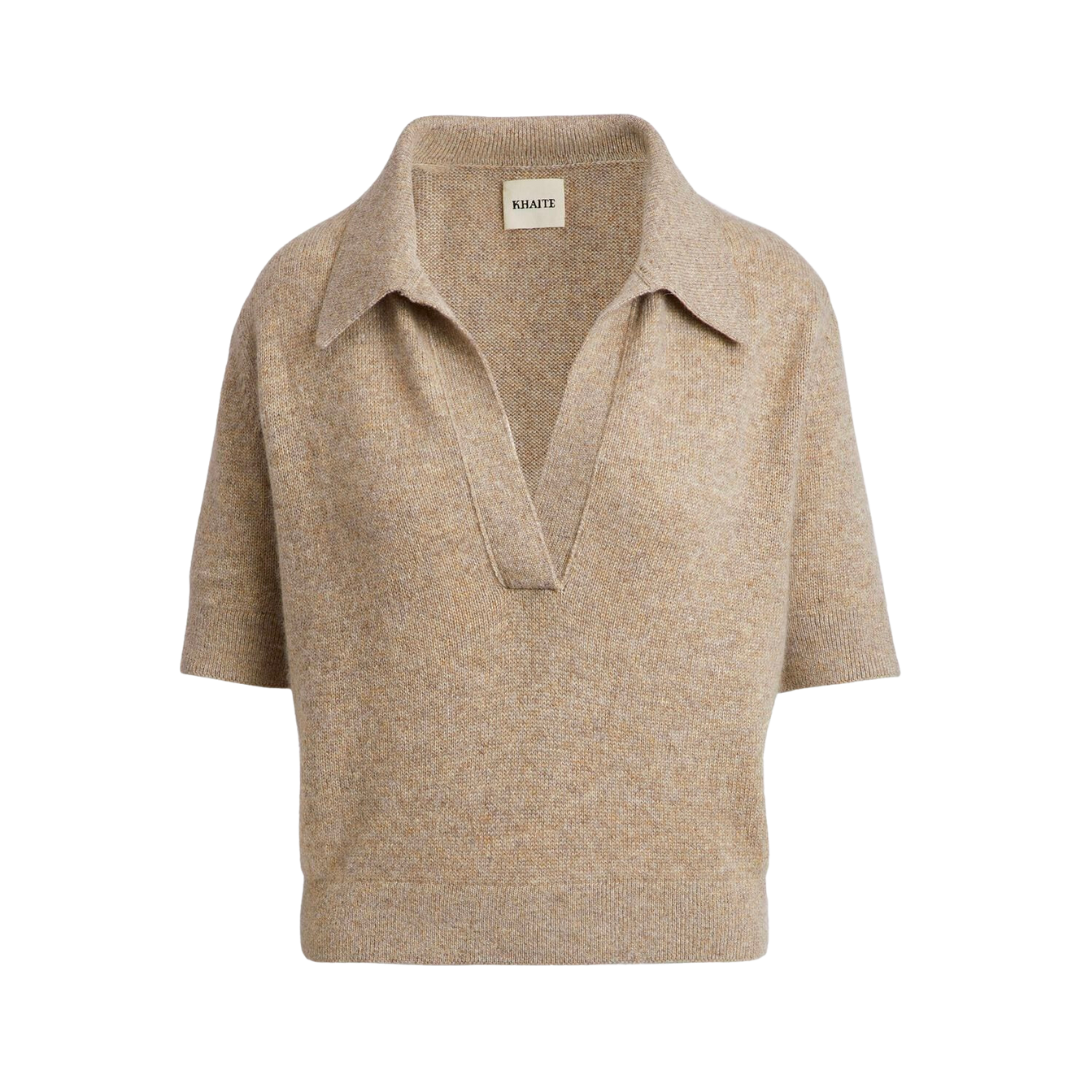 Debuting in an earthy hue for Resort 2023, this open-neck polo is a scaled-down version of the beloved Jo sweater, with a more compact collar and elbow-length sleeves. The relaxed yet feminine silhouette, with its dropped shoulder seams, highlights the plush texture of featherweight cashmere. Ribbed trim accents the neckline, cuffs, and hem.