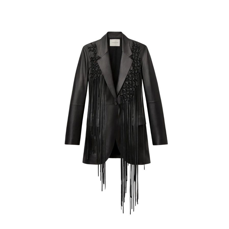 Crafted from Italian nappa leather, this single-button blazer features hand-macramé detailing and exaggerated fringing—a masterful expression of Lafayette 148's technical artistry and embellishment. The relaxed-fit design is balanced by dropped shoulders and an extended cutaway hem.