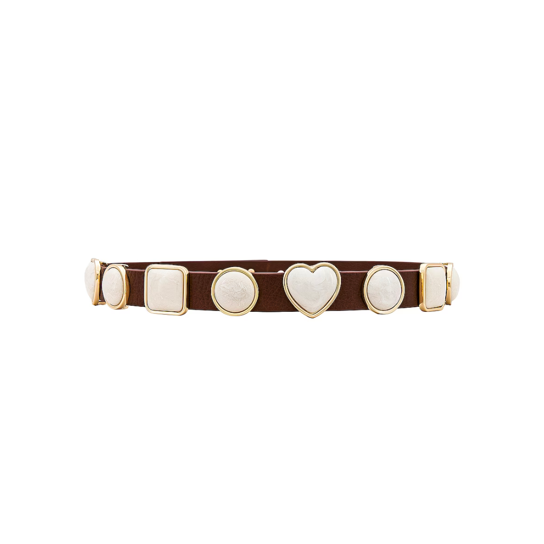 Known for the best in embellished accessories, Lele Sadoughi's pebbled leather belt with mother of pearl heart, square, and round shaped stones provides a unique, jewelry-like touch to the waistline. Push pin closure.