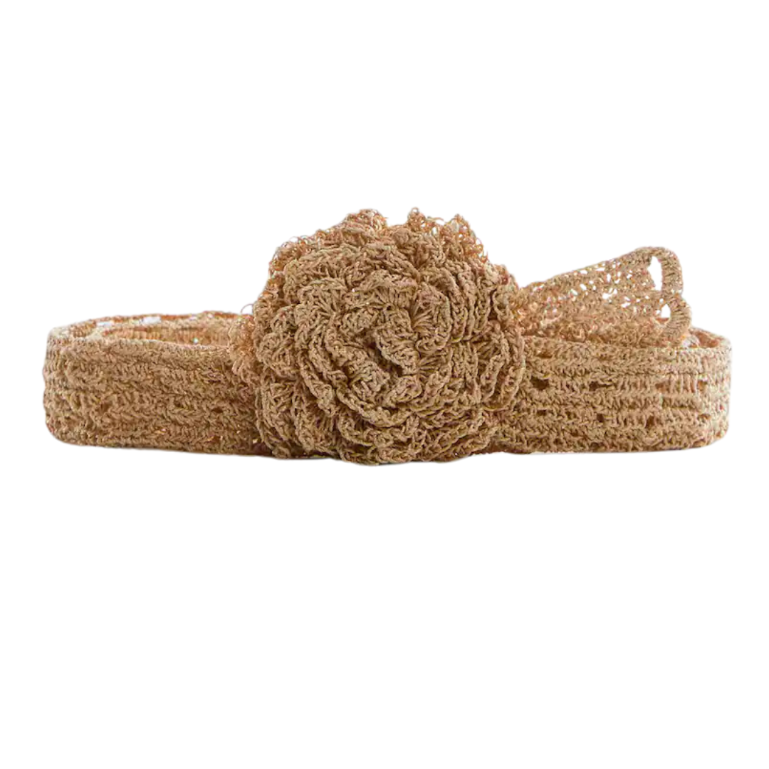 We love the organic woven look of this adjustable-buckle belt with soft flower detail. In a delightfully neutral color, sport it to add rustic flair to chunky knits or belt a caftan in the summer.