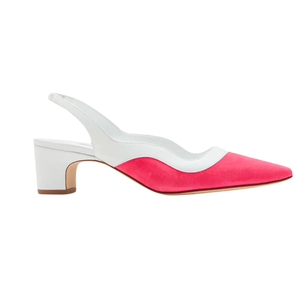 With a contrast leather trim and wave-like handcrafted detailing in a palette of rich brights, Manolo Blahnik's two tone Gogalo slingbacks offer multiple color-pairing possibilities for a dynamic full look.