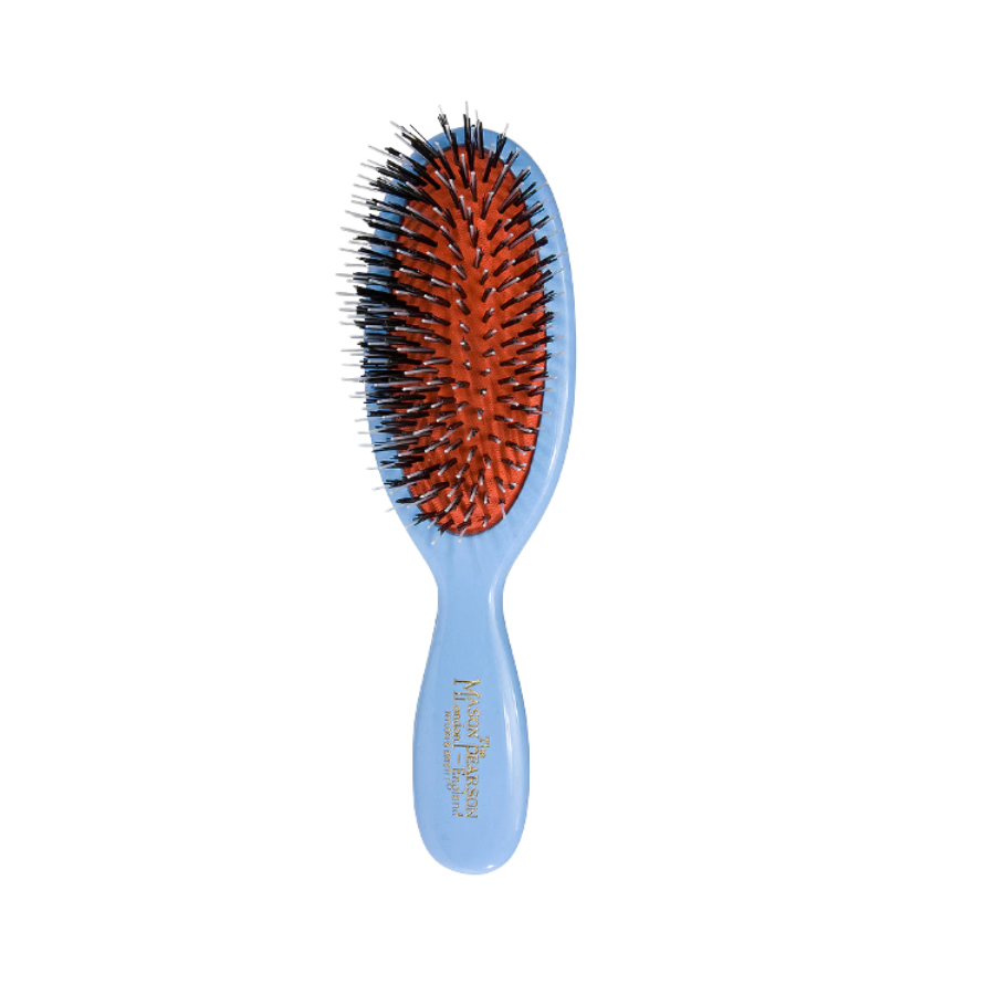 Mason Pearson's classic brush in pocket-size blue. With rubber cushion, boar bristle and nylon tufts.