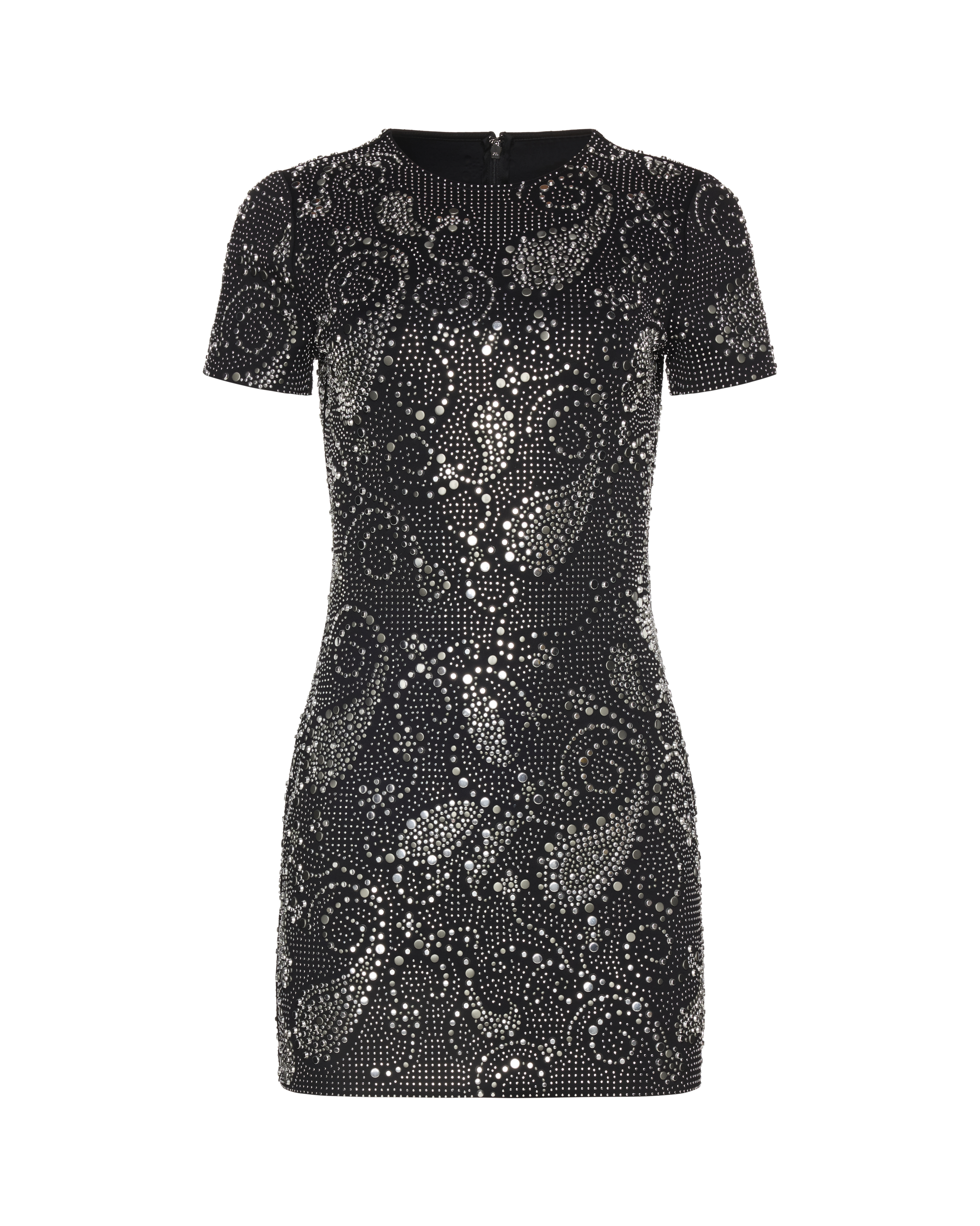 Michael Kors' paisley mini dress makes a statement with its intricate pattern adorned in sparkling studs. Designed with short sleeves and a figure-flattering silhouette, it delivers instant glamour with boho-chic sophistication