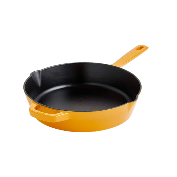 A modern-yet-timeless presence on your table, stove or pot rack, this enameled cast iron skillet delivers serious performance in our exclusive rich mustard hue. Coated with dual layers of porcelain enamel inside and out, the frying pan requires no seasoning. The deep yellow skillet makes a striking presentation, going effortlessly from any type of stovetop to oven to dining table.