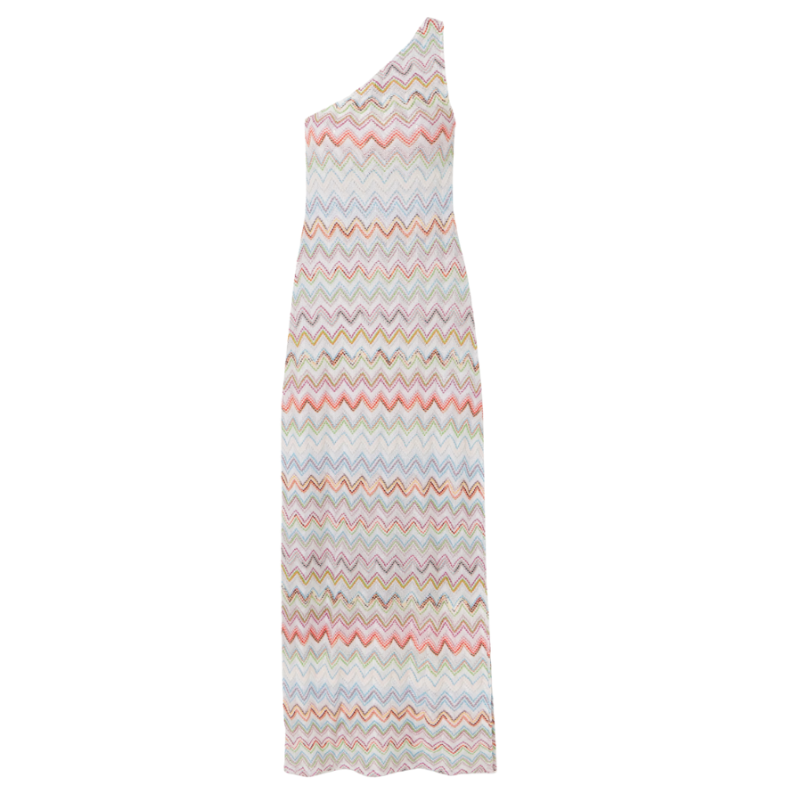 This dress is crochet-knitted in Italy using soft yarns flecked with metallic fibers that catch the light, highlighting the signature chevron pattern.