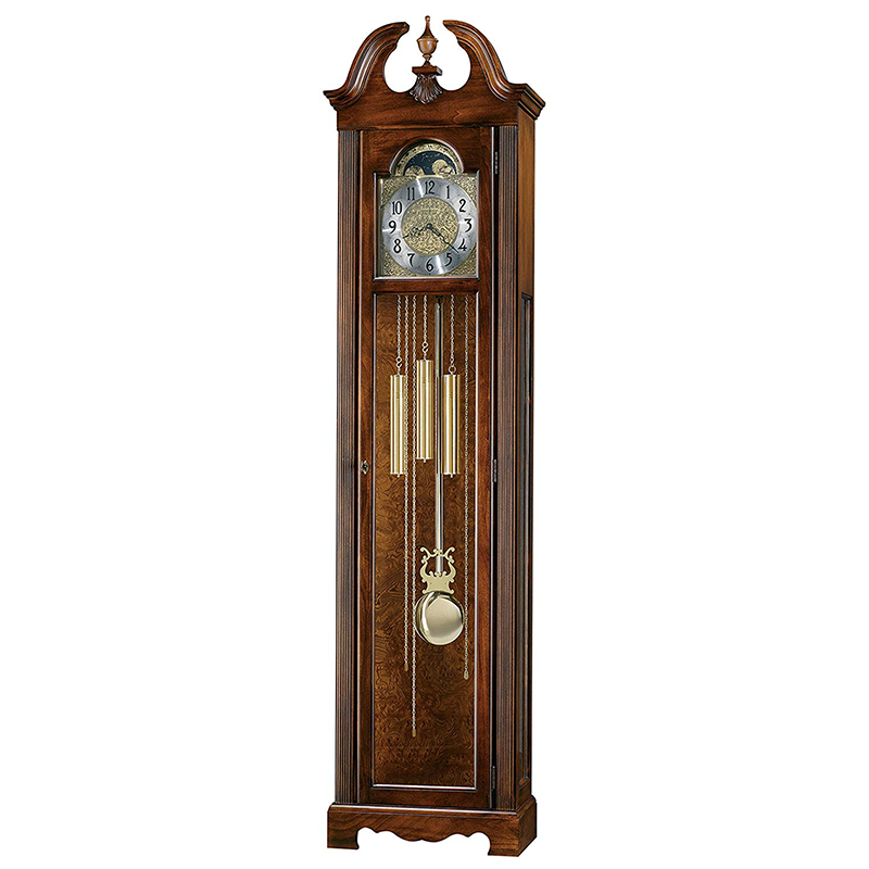 The Princeton Grandfather Clock is finished in Hampton Cherry on select hardwoods and veneers. Swan-neck pediment features a turned urn finial and a decorative shell overlay. Decorative olive ash burl patterned back and bottom panel. Base includes a decorative cutout. Polished-brass dial features elaborate corner spandrels, center disk, silver chapter ring with black Arabic numerals, and a stationary midnight blue moon phase. Hinged door framed by simple but elegant columns.