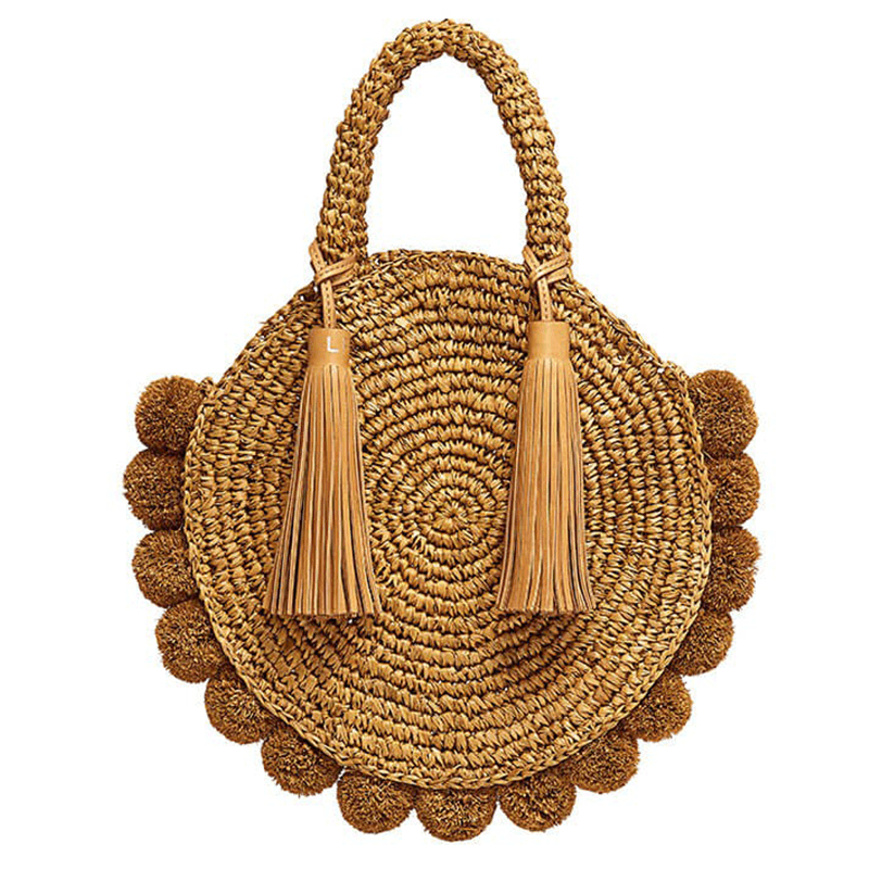 Loeffler Randal produces collections in small batches, using the finest raw materials. This expertly crafted raffia circle tote is adorned with pompoms and leather tassels, taking the straw bag trend to a very sophisticated level.