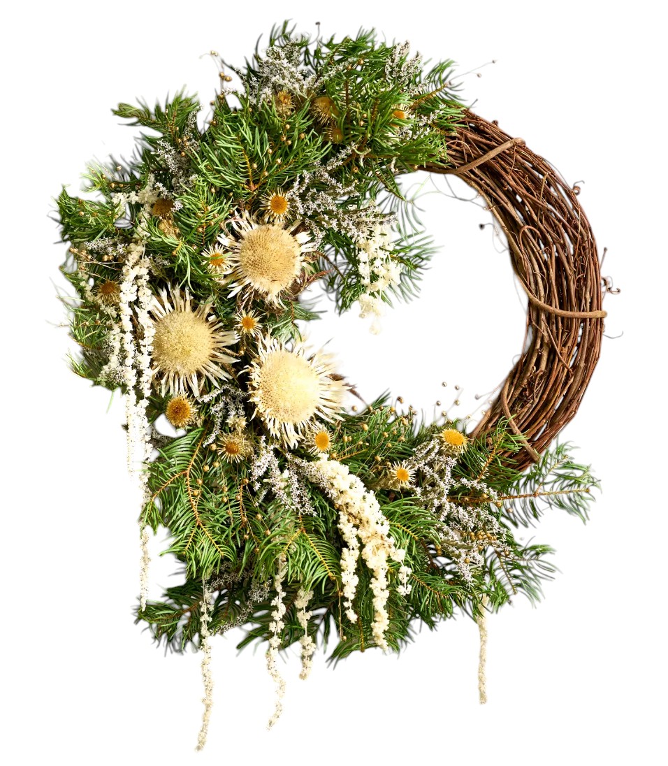 A celebration of the unexpected beauty of foraged botanicals, this asymmetrical wreath is finished with a dreamy mix of noble fir, moon flower thistle, amaranth, and flax. Each wreath is made especially for terrain in Right Side Hand’s California floral studio.