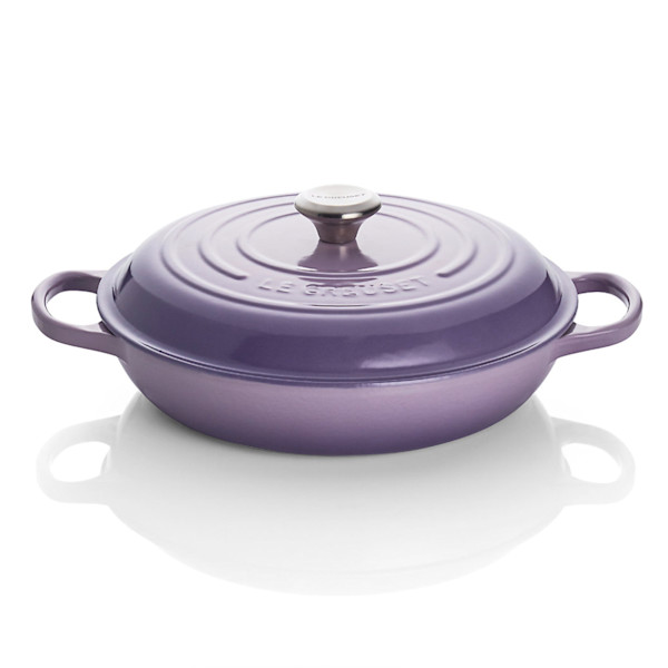 Inspired by the fragrant, sun-drenched lavender fields of southern France, Le Creuset's new take on purple brings a modern sensibility to its traditional round everyday pan. Made of cast iron, the braiser pan is clad in smooth, vitrified porcelain, rendering each piece impervious to acid, alkali, odors and stains. Perfect for family-size stews, paella or rice, the pan does not does not require seasoning and braises to perfection with wet or dry cooking methods. The non-reactive cooking surface is compatible with all types of heat sources, from gas and electric stoves, to ceramic and glass cooktops, to induction and halogen—even solid fuel and open fire. Revered by both professional chefs and home cooks since its 1925 debut, Le Creuset's classic French cookware is prized for its utilitarian good looks and unsurpassed heat retention.