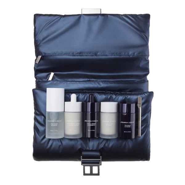 The Kit is an integrated set of seven skincare essentials formulated by renowned esthetician Joanna Czech. Her thirty five years of knowledge and experience are at the core of each formula. Contains The Toner, to balance, hydrate, restore; the C+ Serum, to brighten, hydrate, strengthen; The Soothing Serum, to calm, hydrate, restore; The Cream, to restore, hydrate, strengthen; The Balm to hydrate, restore, tone; The Cleansing Wipes to refresh, soothe; and The Face Mask, to comfort, hydrate, calm.
